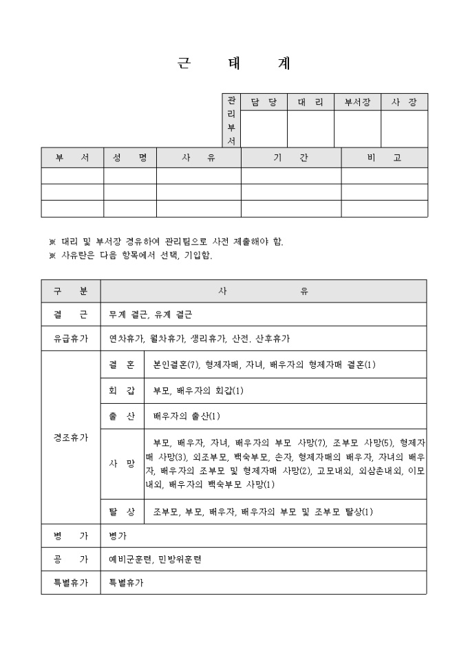 사유중심의 근태계로 결근, 유급휴가, 경조휴가, 병가, 공가, 특별휴가로 구성되어 있습니다.