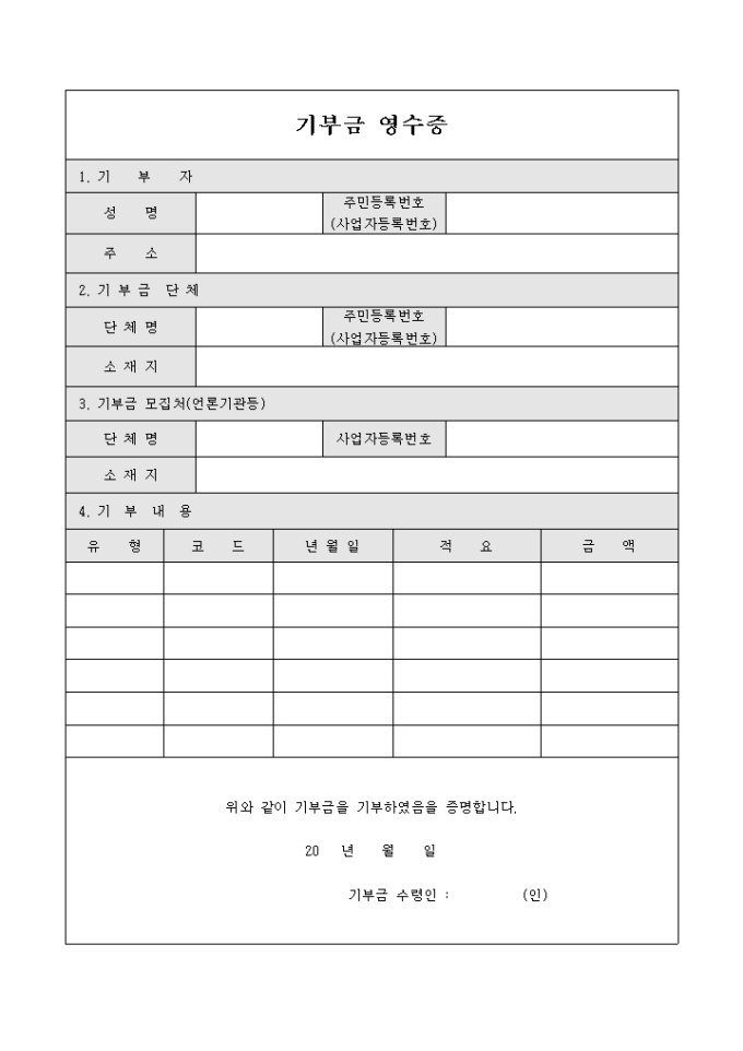 기부금 영수증으로 기부자, 기부금단체, 모집처, 기부내용등의 항목으로 구성되어 있습니다.
