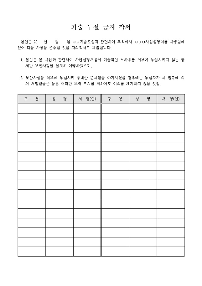 9,000원/월기술도입과 관련된 사업 설명회를 시행 함에 있어 외부에 노하우를 누설하지 않겠다는 내용의 각서입니다.
