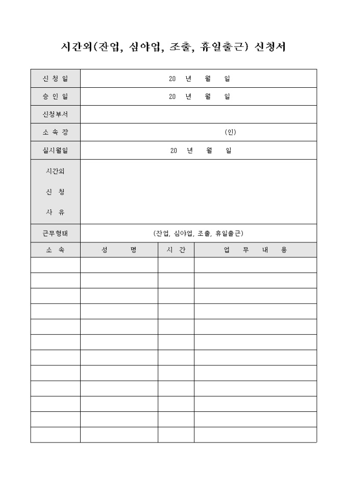 시간외근무 신청서(잔업,심야업,조출,휴일출근)