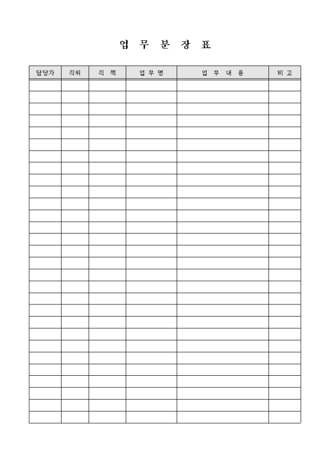 업무에 대한 내용을 작성하는 간단한 업무분장표 양식입니다. 담당자, 직위, 직책, 업무명, 업무내용 등의 항목으로 구성되어 있습니다.