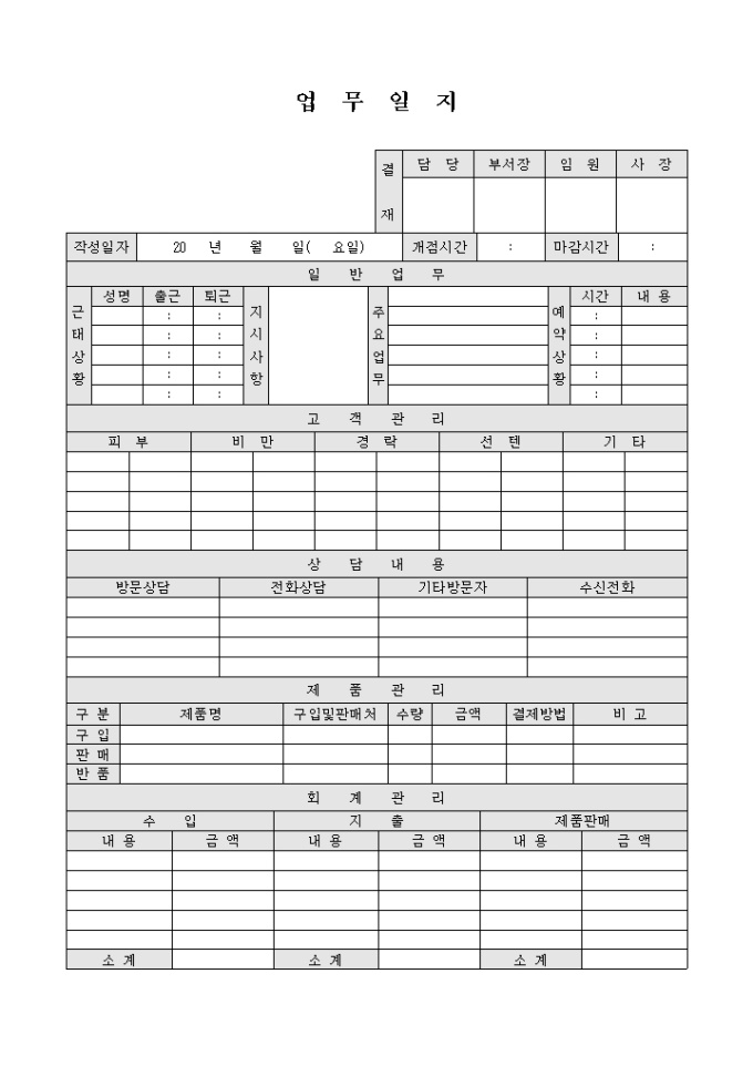 9,000원/월스포츠 마사지 샵에서 사용 할 수 있는 업무일지 양식입니다. 일반업무 내용과 고객관리, 고객 상담내용, 제품관리, 회계관리 등의 항목으로 구성되어 있습니다.