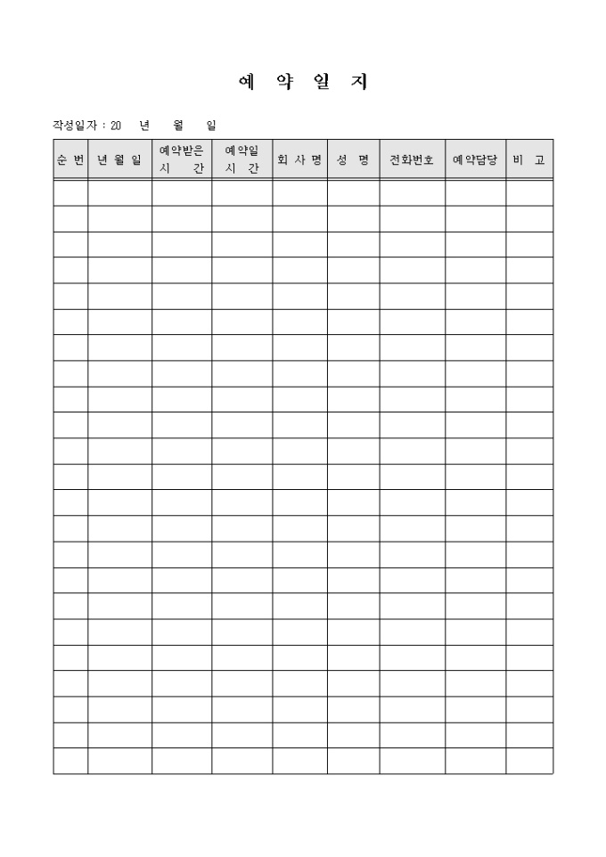 년월일, 예약받은 시간, 예약일 시간, 회사명, 성명, 전화번호, 예약담당등의 항목을 기재할 수 있는 일반적으로 사용할 수 있는 예약일지 양식입니다.