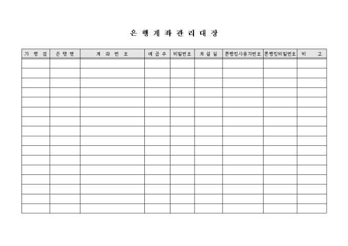 9,000원/월은행계좌를 관리하기 위한 은행계좌 관리대장 양식입니다. 가맹점, 은행명, 계좌번호, 예금주, 비밀번호, 개설일, 폰뱅킹사용자번호 등의 항목으로 구성되어 있습니다.