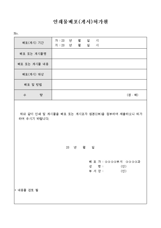 9,000원/월인쇄물을 배포(게시) 하기위하여 허락을 구하는 내용의 인쇄물 배포(게시) 허가원 양식입니다. 배포기간, 게시물명, 게시물내용, 배포대상, 배포및 방법, 수량 등의 항목으로 구성되어 있습니다.