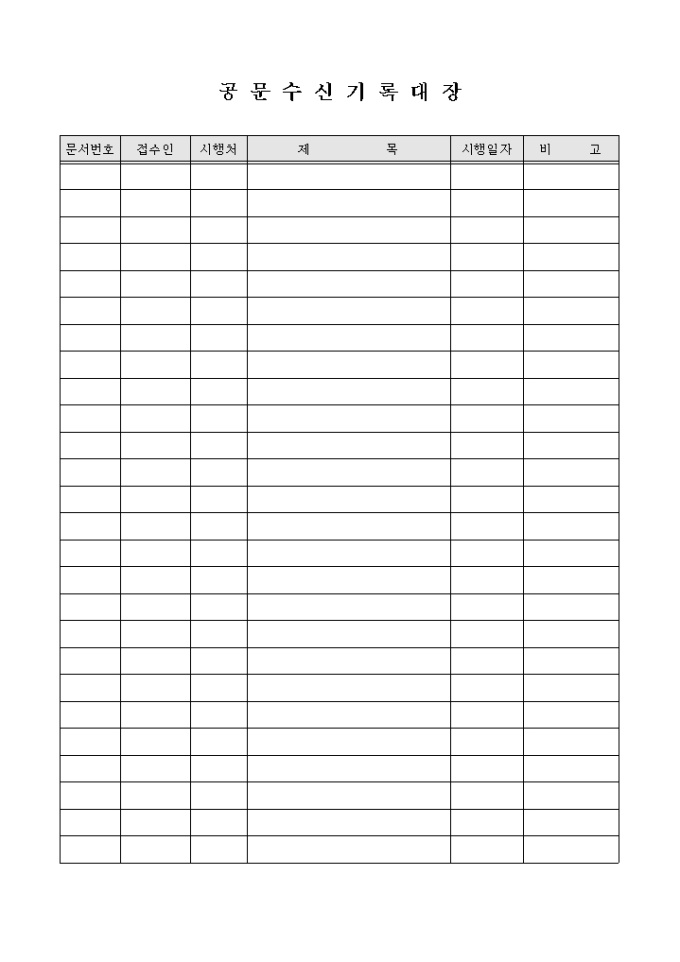 9,000원/월공문의 수신을 기록하는 대장으로 문서번호, 접수인, 시행처, 문서제목, 시행일자로 구성되어 있습니다.