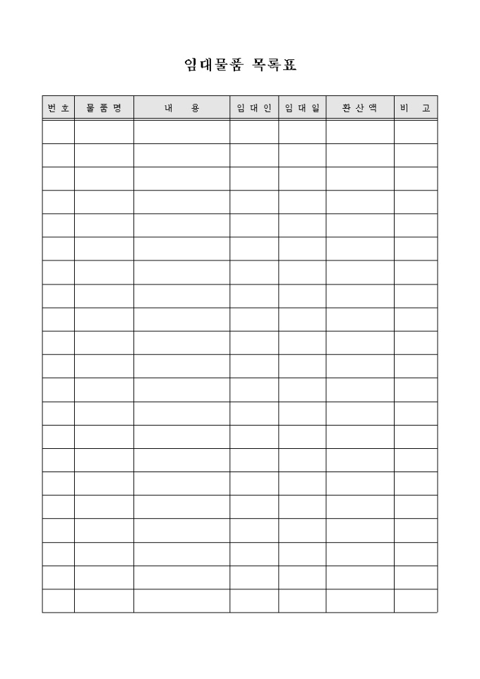 임대물품을 기록, 관리 하기 위한 임대물품 목록표 양식입니다. 물품명, 내용, 임대인, 임대일, 환산액 등의 항목을 기재할 수 있습니다.