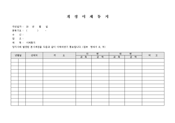 지사에서 본사로의 계정을 이체 한다는 내용의 계정이체 통지 서식입니다. 작성일자, 분류기호, 년월일, 상대처, 적요, 차변, 대변 등의 항목을 기재할 수 있습니다.