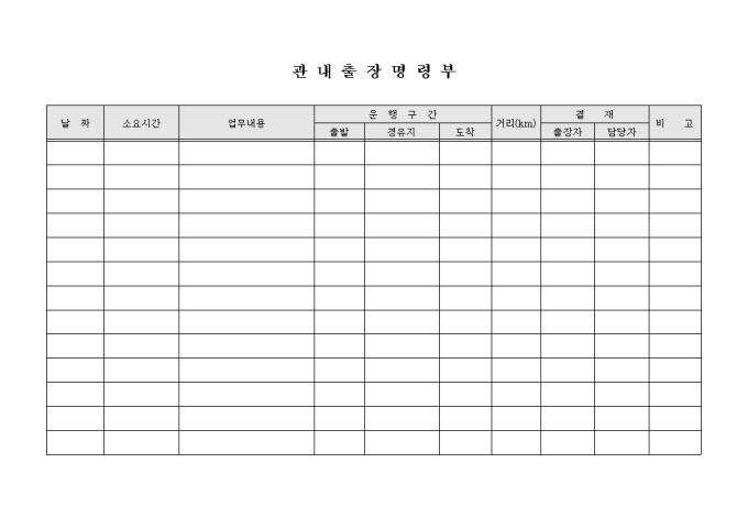 관내에 자동차를 타고 용무를 볼 경우에 기입하는 서식으로 업무내용, 운행구간, 거리, 결재등의 항목으로 구성되어 있습니다.
