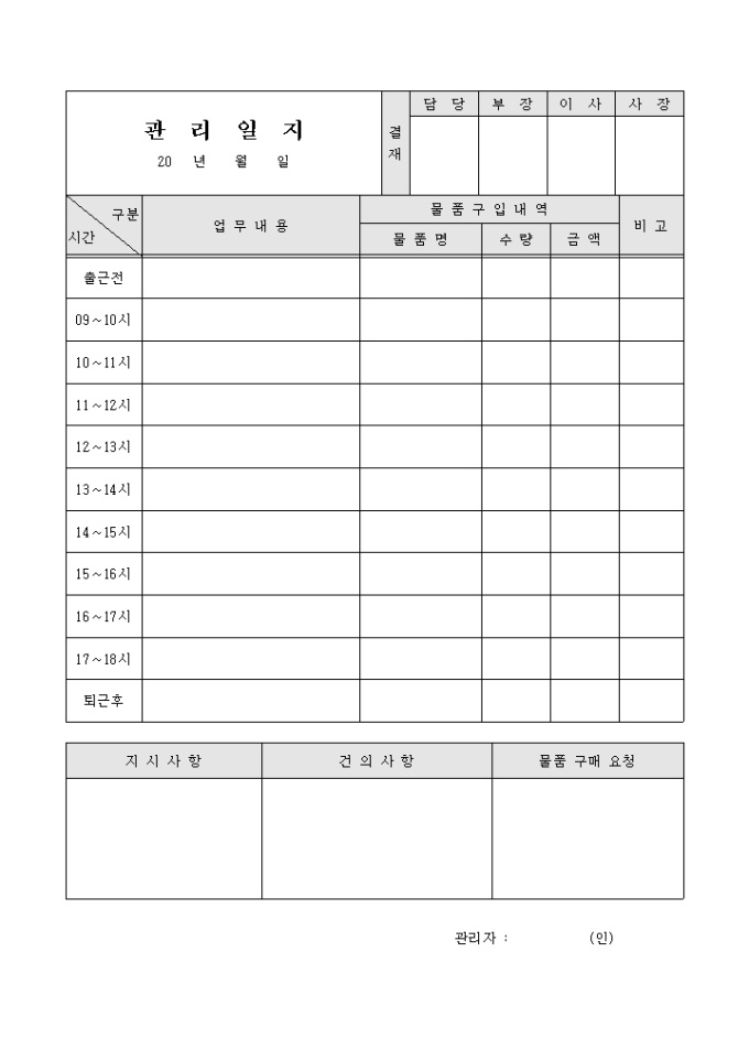 시간별로 기입할 수 있으며 지시사항, 건의사항, 물품 구매요청의 항목등이 있습니다.