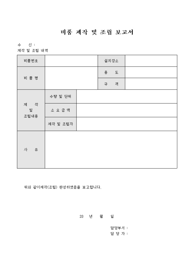 비품 제작 및 조립보고서로 비품번호, 설치장소, 비품명, 제작및조립내역, 사유등의 항목으로 구성되어 있습니다.