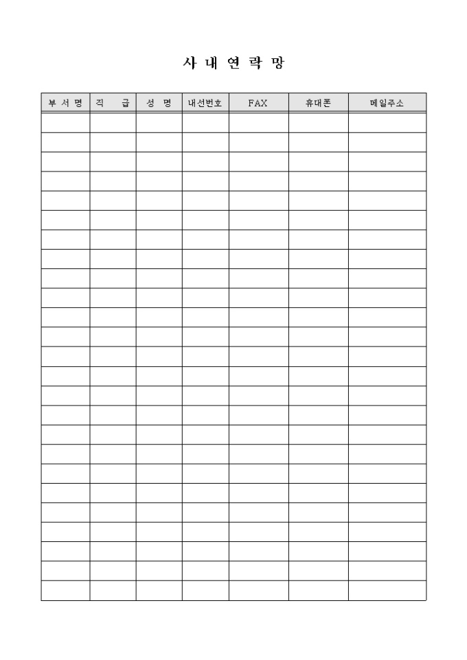 회사내의 연락망을 총괄하는 서식으로 내선번호, FAX, 휴대폰, 메일주소 등의 항목을 기입할 수 있습니다.