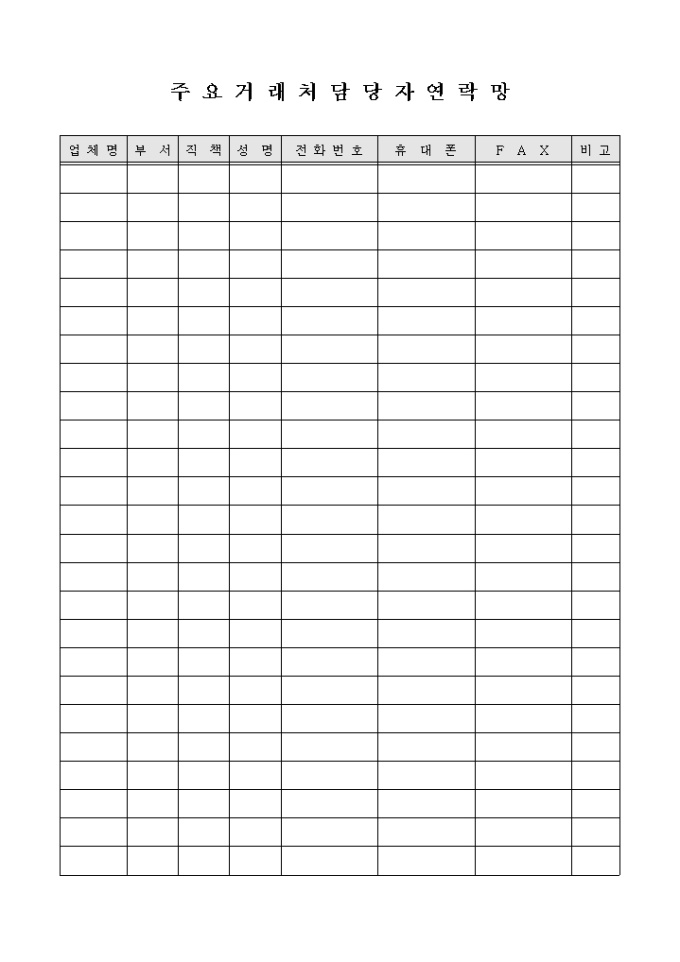 주요거래처담당자의 연락망을 관리하기 위한 서식으로 전화번호, 휴대폰, FAX 등의 항목을 기입할 수 있습니다.