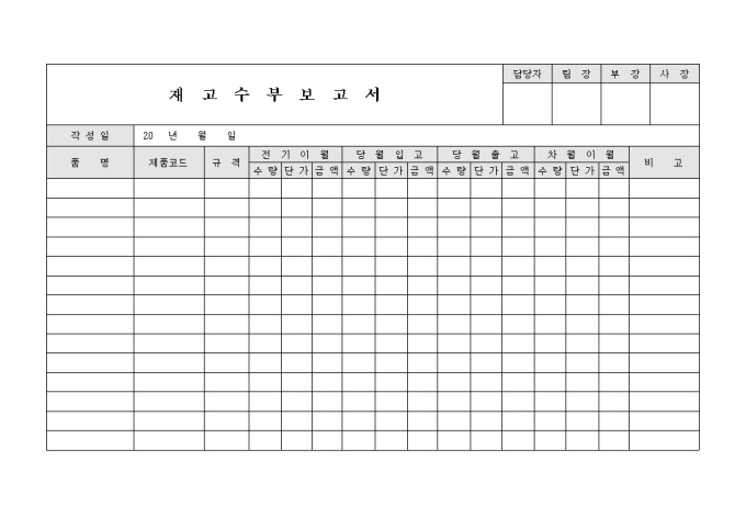 재고수부보고서로 품명, 제품코드, 규격, 전기이월, 당월입고, 당월출고, 차월이월 등의 항목으로 구성되어 있습니다.