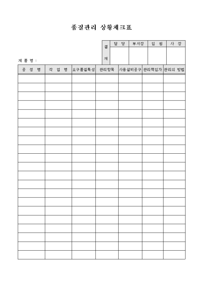 9,000원/월제품의 품질관리를 체크하기위한 품질관리 상황체크표 양식입니다. 제품의 공정명, 작업명, 요구품질특성, 관리항목, 사용설비공구, 관리책임자, 관리의 방법 등의 항목을 작성할 수 있습니다.