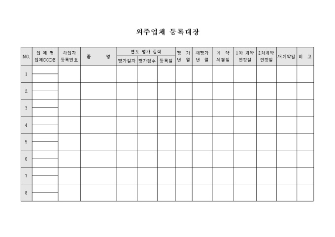 외주업체 등록대장입니다. 외주업체를 평가할때 사용며 실적등을 기록할수 있습니다.