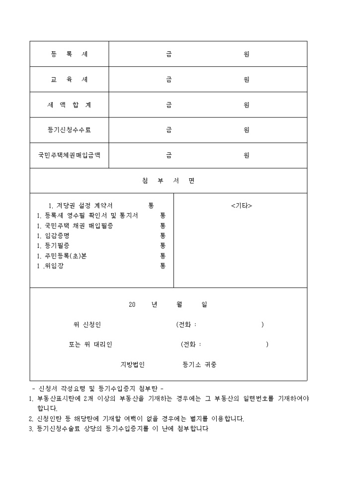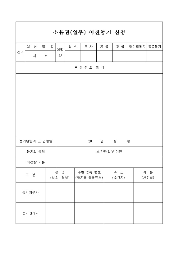 소유권 이전등기 신청서 양식입니다. 부동산의 표시와 등기원인과 그 연월일, 등기의 목적, 이전할 지분등을 표시하도록 되어 있습니다.