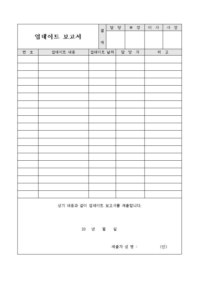 9,000원/월업데이트의 내용과 업데이트 날짜, 담당자의 확인등을 보고서 형식으로 제출시 사용되는 문서입니다.