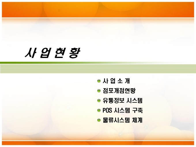 유통업체의 회사소개서입니다. 목차는 크게 1.회사소개 2.사업현황 3.시장분석 4.사업추진전략으로구성되어 있습니다.