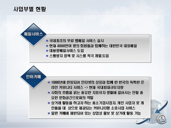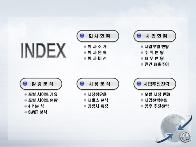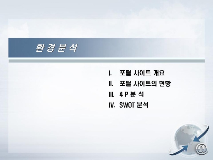 포털사이트의 사업계획서입니다. 목차는 크게 1.회사현황 2.사업현황 3.환경분석 4.시장분석 5.사업추진전략으로 구성되어 있습니다.