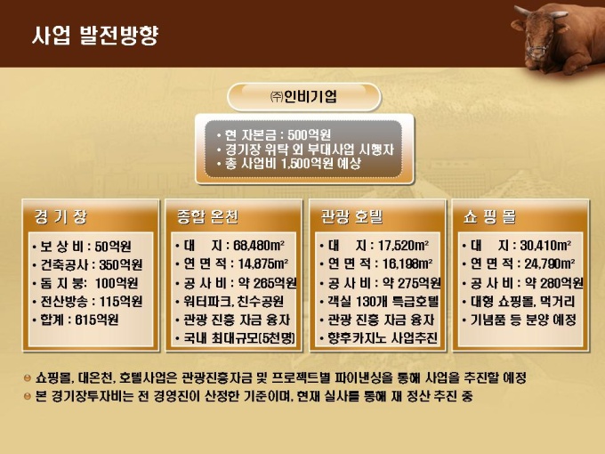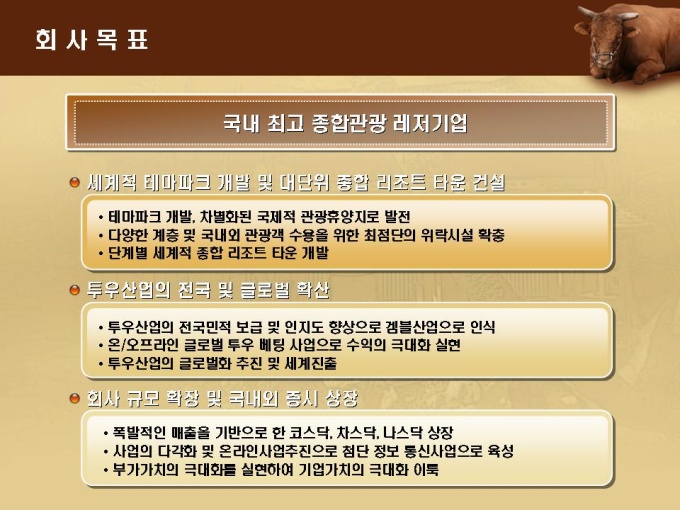 종합관광 레저기업의 사업계획서입니다. 목차는 1.회사소개 2.사업개요 3.사업추진계획 4.자금 투자계획 5.추정 재무제표로 구성되어있습니다.