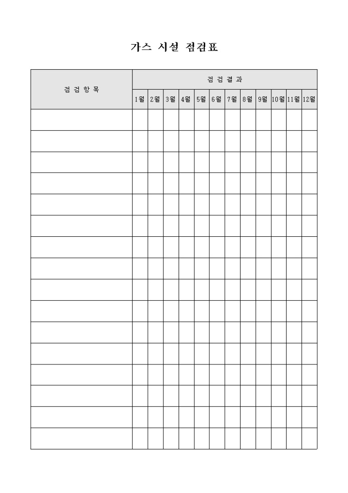 9,000원/월연간 가스 시설 점검사항을 체크하기 위해 만들어졌으며 점검항목에 따른 월별 이상유무를 체크할 수 있게끔 제작된 서식입니다.