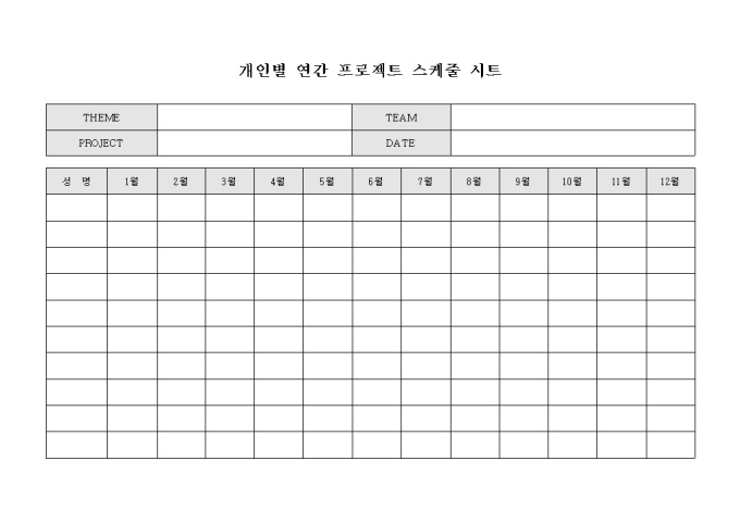 9,000원/월연간 프로젝트 스케줄을 개인별로 기록할 수 있도록 구성된 스케줄 시트입니다. 프로젝트 테마와 기록날짜, 프로젝트 명으로 구성되어 있습니다.
