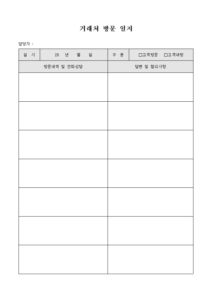 거래처 방문일지 입니다. 방문내역 및 전화상담 기록과 답변 및 협의사항등을 기록할 수 있습니다.