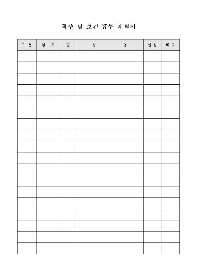 9,000원/월격주 및 보건 휴무 계획서입니다. 일자, 팀, 성명, 휴무 인원 등으로 구성되어 있습니다.