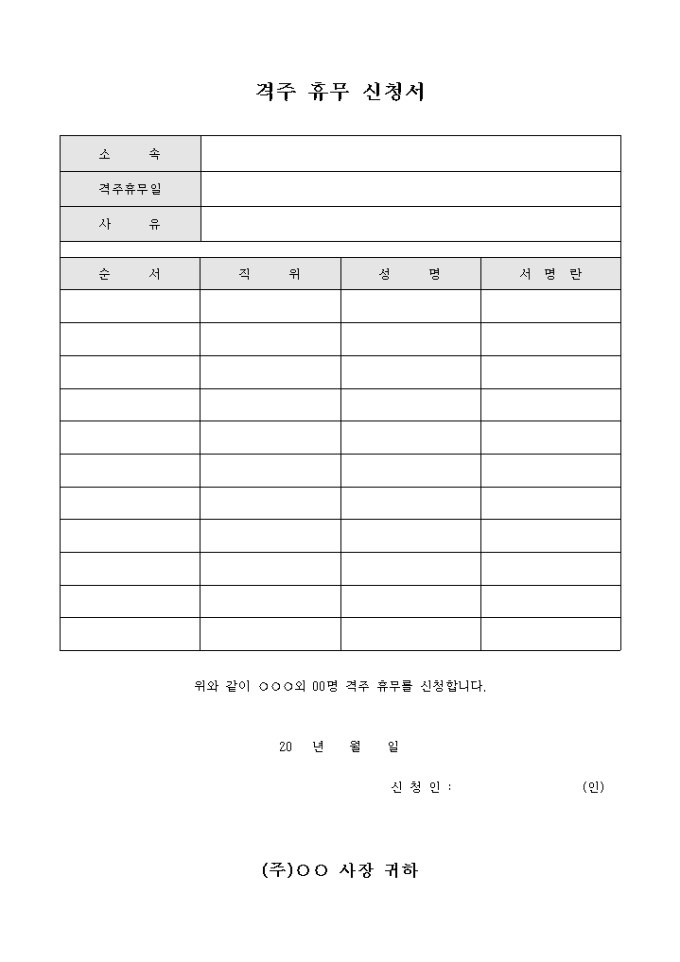9,000원/월격주 휴무 신청서입니다. 격주 휴무를 신청할 때 사용됩니다. 격주휴무 날짜와, 사유, 성명 등으로 구성되어 있습니다.