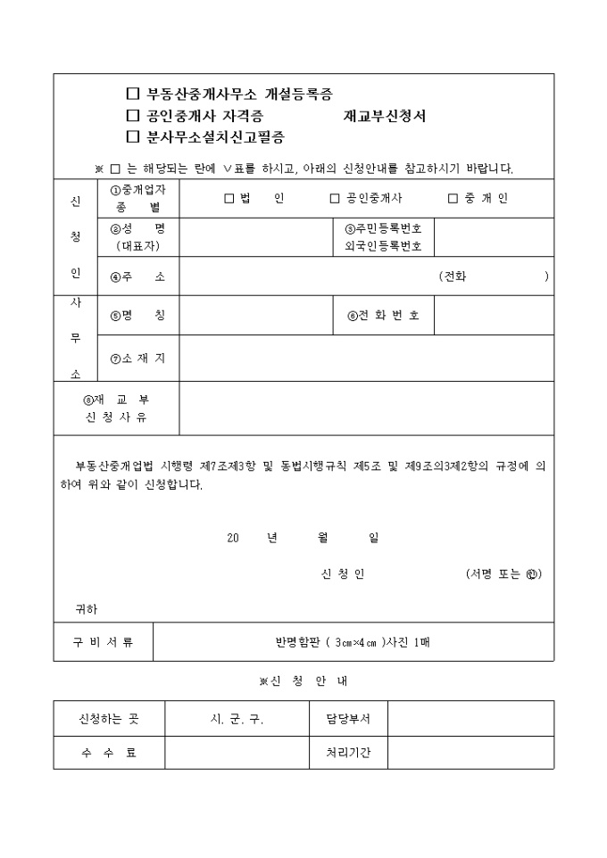 9,000원/월부동산중개업법 시행령 제7조제3항 및 동법시행규칙 제5조 및 제9조의3제2항의 규정에 의하여 중개 사무소 개설 등록증,공인중개사 자격증, 분사무소설치 신고필증등의 재교부를 신청할 때 사용하는 양식입니다.