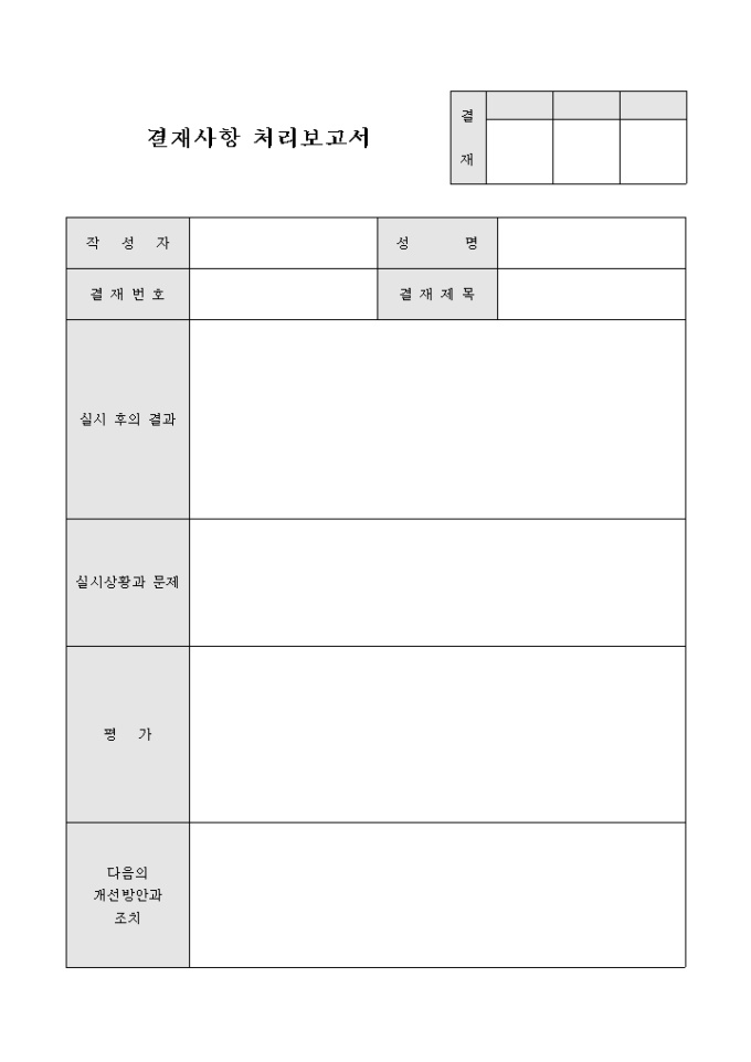 결재사항처리의 결과와 문제상황, 평가 등을 기록할 수 있는 결재사항 처리 보고서입니다.