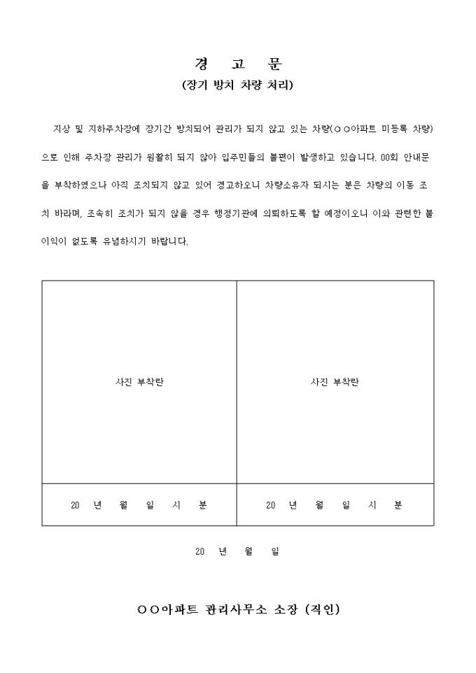 9,000원/월아파트 관리 사무소에서 장기 방치 차량 처리시 사용되는 경고문입니다.
