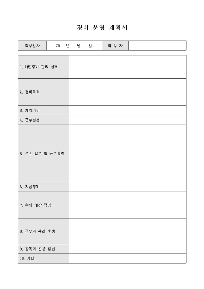 경비운영계획서 입니다. 경비관리 실태와 목적, 계약기간, 근무 편성등을 할수 있는 경비운영 계획서입니다.