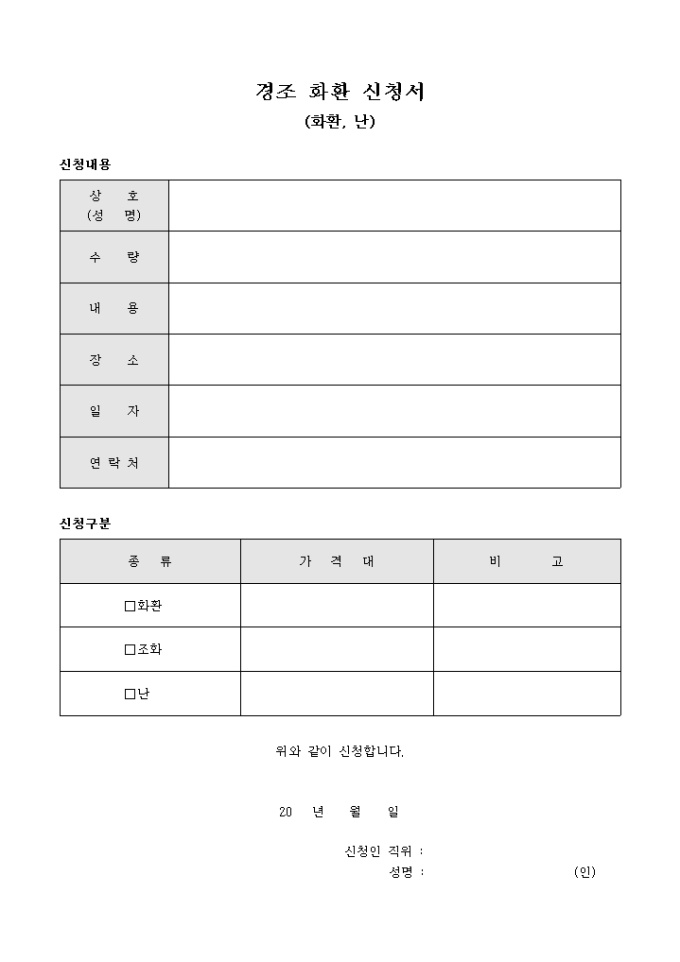 9,000원/월경조화환 신청서 입니다. 배달일자와 전달내용, 전달품목등을 기록할수 있습니다.