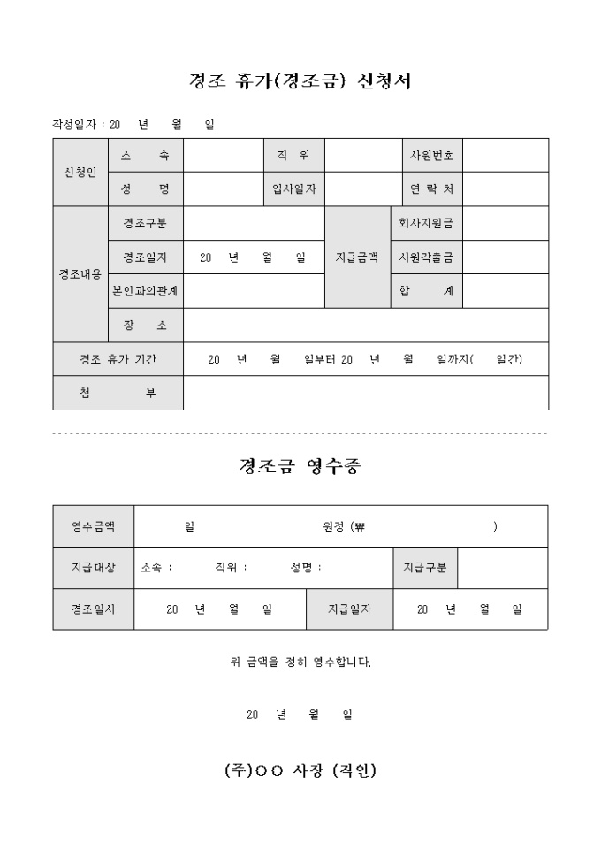 9,000원/월경조 휴가(경조금)을 신청하고자 할때 사용되는 신청서와 경조금 영수증 입니다.