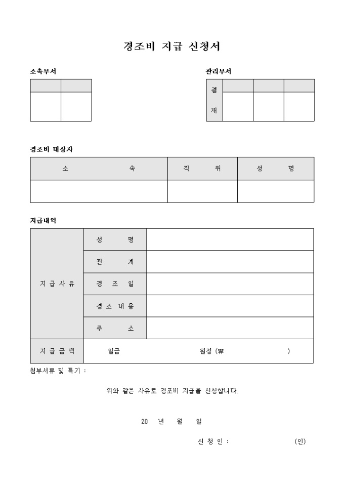 9,000원/월경조비 지급 신청서 입니다. 경조비 대상자의 정보와 지급내역에 대한 기록을 작성할수 있는 문서입니다.