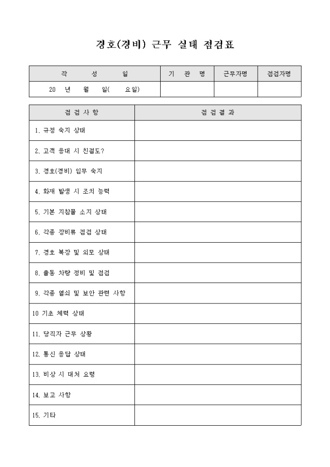 9,000원/월경호 근무 실태 점검표 입니다. 점검사항과 점검결과등을 기록할수 있으며 점검결과에 대해 서술할수 있도록 구성되어 있습니다.