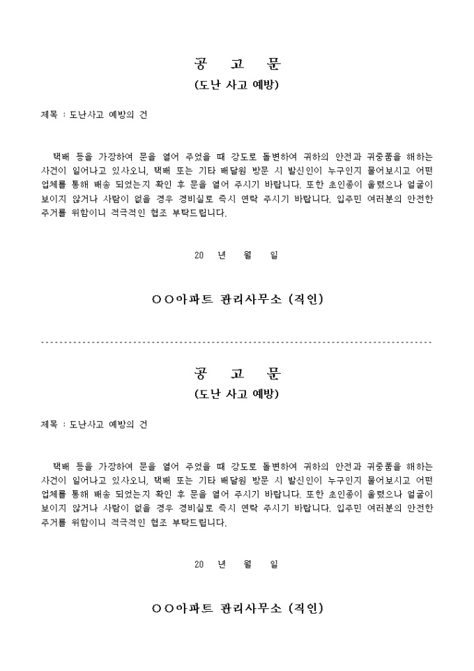 아파트 관리 사무소에서 사용하는 도난 사고 예방에 대한 공고문입니다.