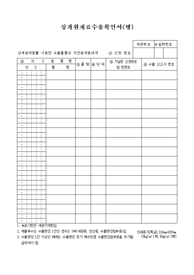 상계원재료 수출 확인서 양식입니다. 상계원재료를 사용한 수출물품의 직전원재료내역을 확인받는 양식입니다.