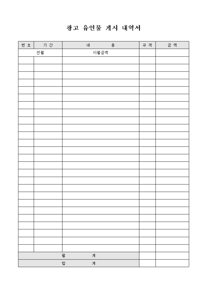 광고 유인물 게시내역을 확인할수 있는 유인물 게시 내역서 입니다. 기간, 규격, 내용, 금액등으로 구성되어 있습니다.