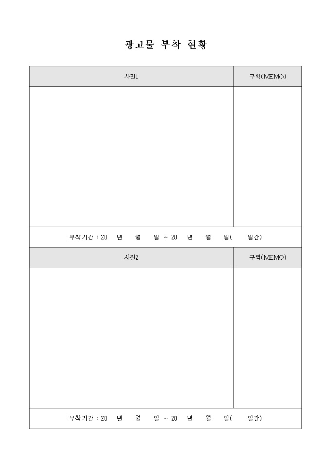 광고물의 부착 현황을 광고물 부착 사진과 구역 등으로 나타내는 광고물 부착 현황 양식입니다.