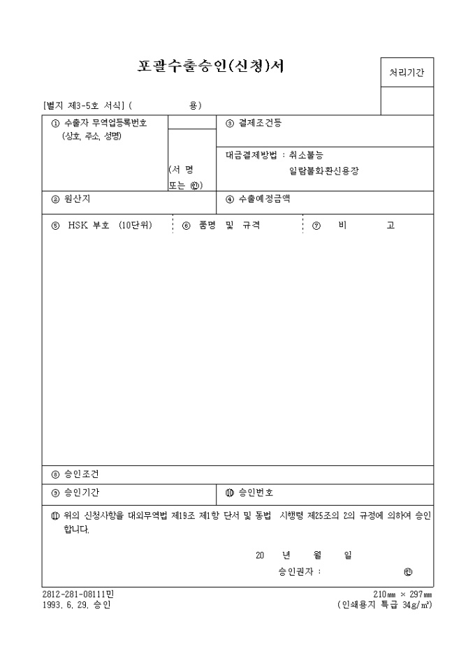 9,000원/월포괄 수출 승인(신청)서 양식입니다.