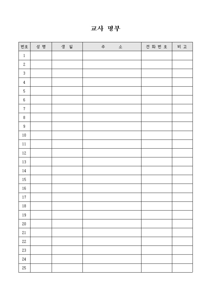 9,000원/월성명, 생일, 주소, 전화번호 등으로 구성된 교사명부입니다.