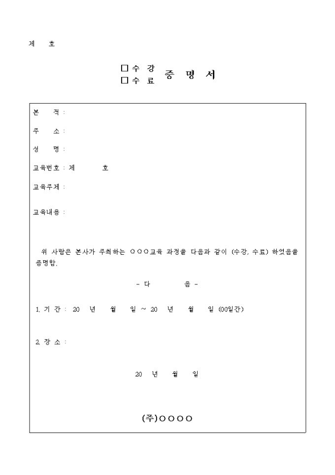 수강(수료) 증명서 입니다. 교육과정을 수강(수료) 하였음을 증명하기 위해 사용하는 문서 입니다.