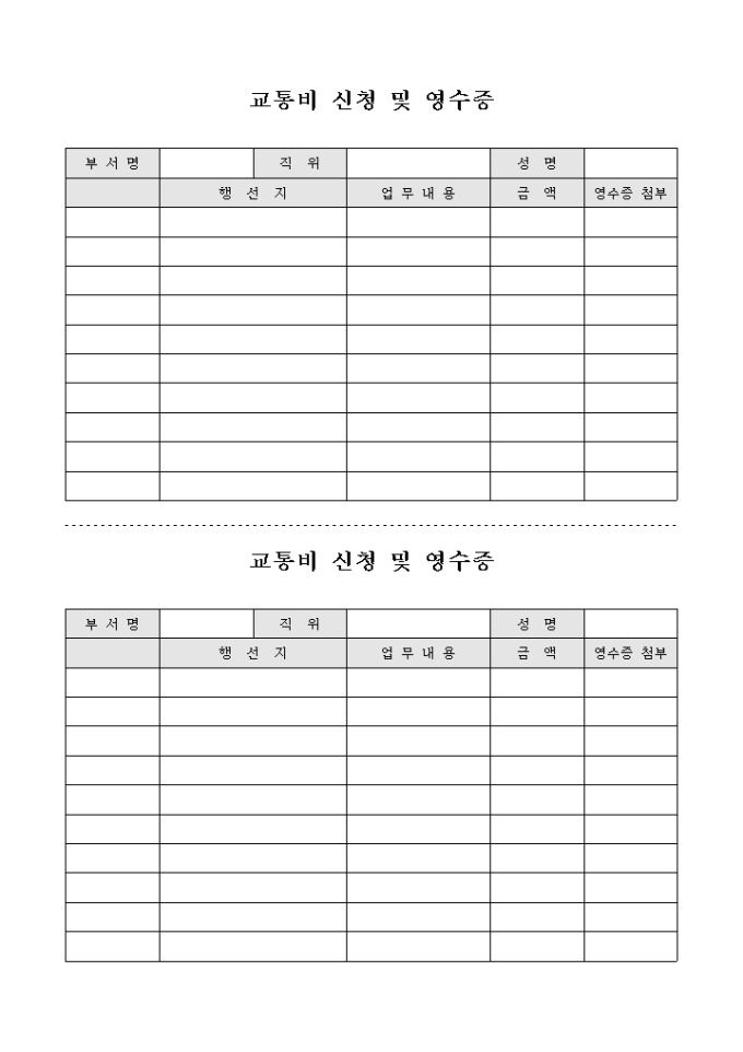 9,000원/월교통비를 신청할때 신청서입니다. 행선지와 업무내용, 금액, 영수증 첨부등으로 구성되어 있습니다.