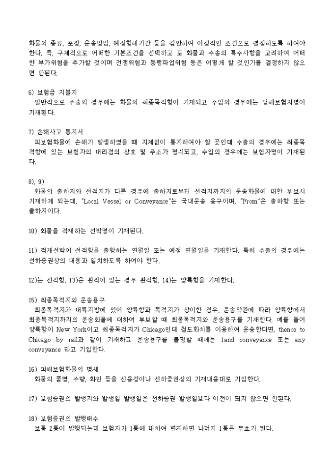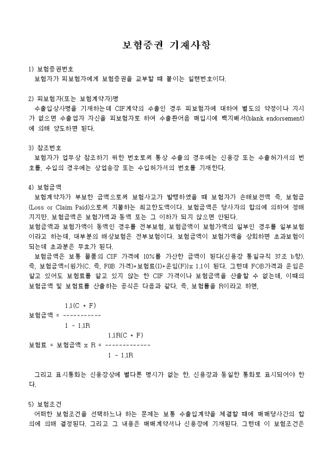 보험증권 기재사항 안내서 입니다. 보험증권 기재사항 1) 보험증권번호 보험자가 피보험자에게 보험증권을 교부할 때 붙이는 일련번호이다. 2) 피보험자(또는 보험계약자)명 수출입상사명을 기재하는데 CIF계약의 수출인 경우 피보험자에 대하여 별도의 약정이나 지시가 없으면 수출업자 자신을 피보험자로 하여 수출환어음 매입시에 백지배서(blank endorsement)에 의해 양도하면 된다. ...