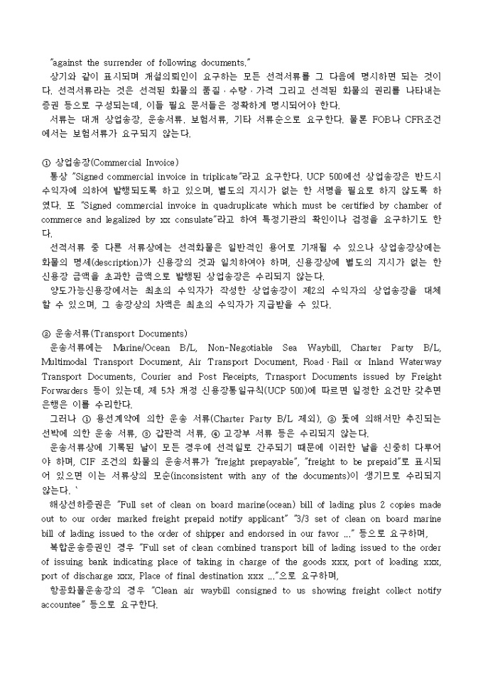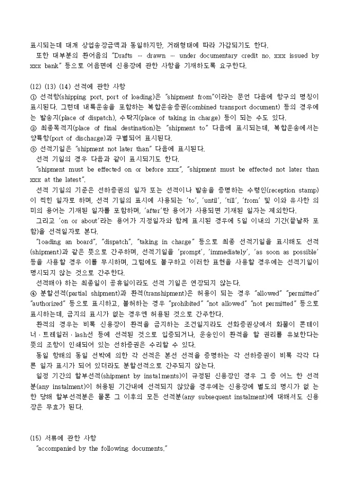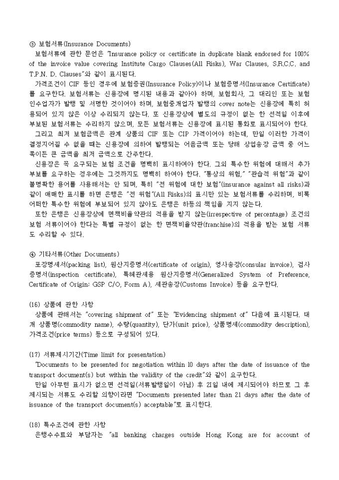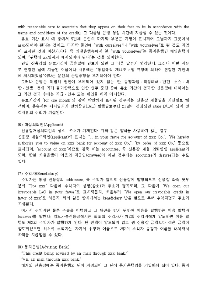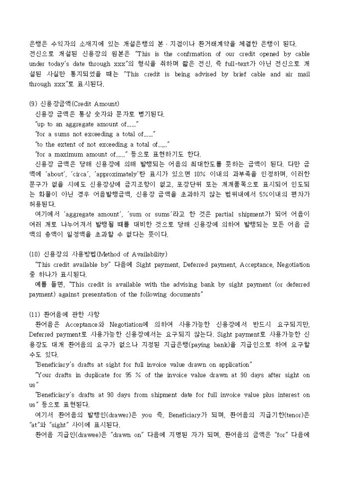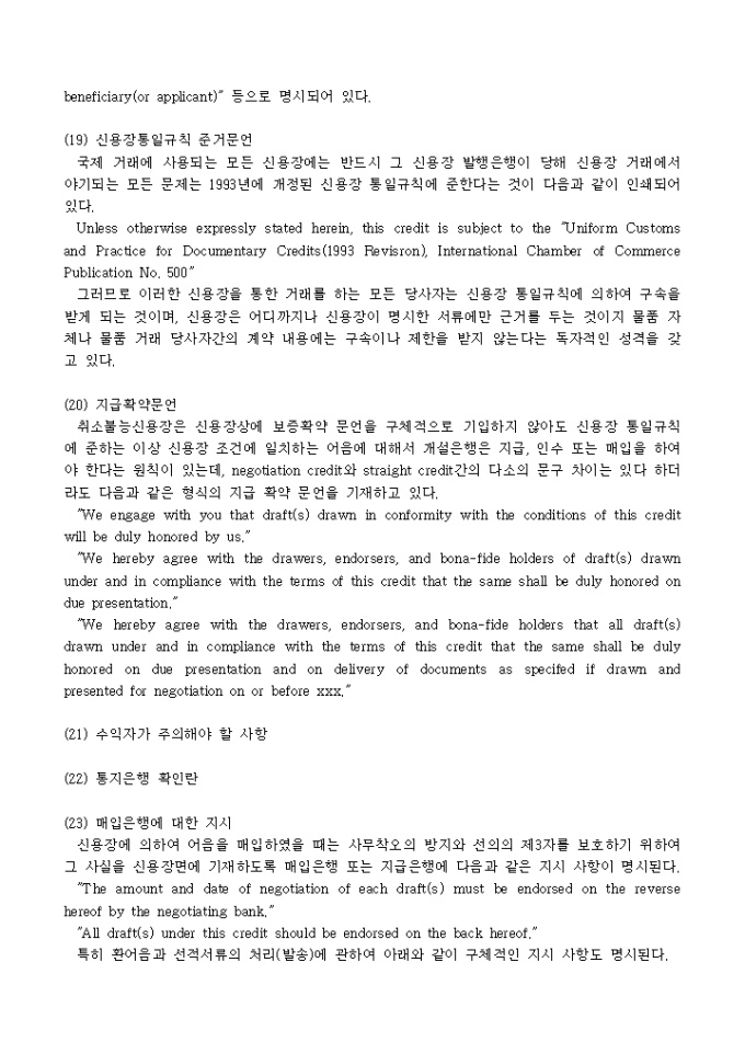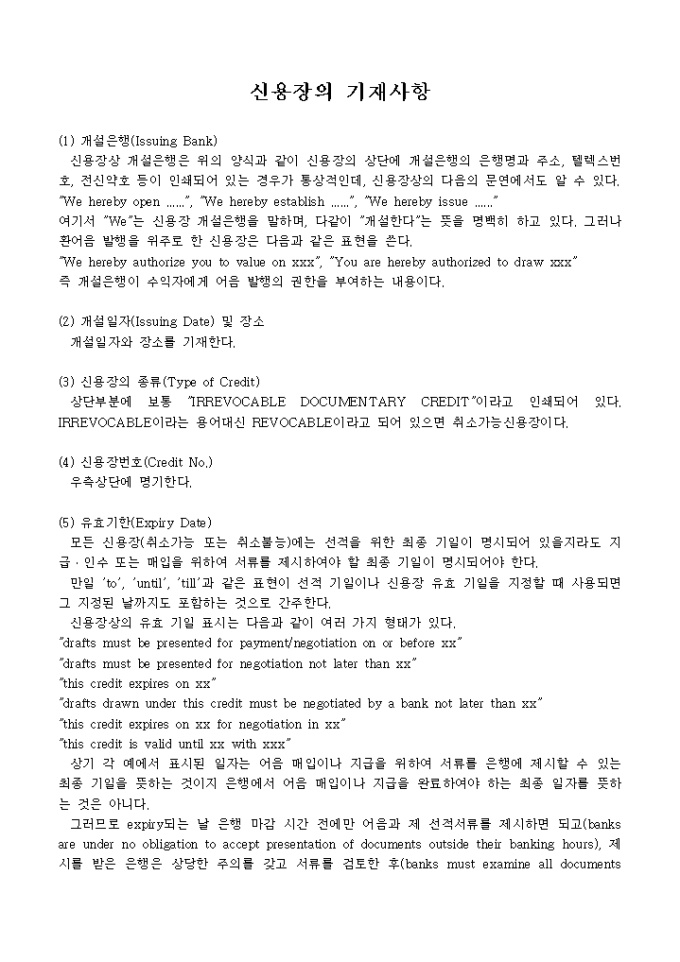 LC,신용장의기재사항 안내서 입니다. (1) 개설은행(Issuing Bank) 신용장상 개설은행은 위의 양식과 같이 신용장의 상단에 개설은행의 은행명과 주소, 텔렉스번호, 전신약호 등이 인쇄되어 있는 경우가 통상적인데, 신용장상의 다음의 문연에서도 알 수 있다. 'We hereby open ......', 'We hereby establish ......', 'We hereby issue ......' 여기서 'We'는 신용장 개설은행을 말하며, 다같이 '개설한다'는 뜻을 명백히 하고 있다. 그러나 환어음 발행을 위주로 한 신용장은 다음과 같은 표현을 쓴다.