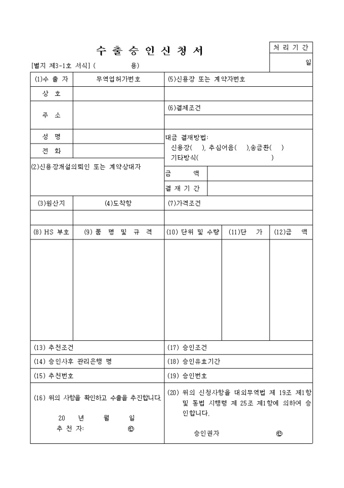 9,000원/월별지 제3-1호 서식으로 신청사항을 대외무역법 제 19조 제1항 및 동법 시행령 제 25조 제1항에 의하여 승인받아야 합니다.