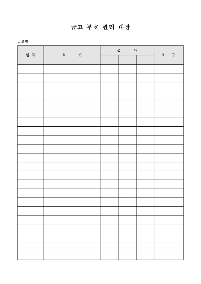 금고부호 관리대장입니다. 일자, 적요, 결재, 비고란으로 구성되어 있으며 금고부호를 관리하고자 할때 사용하는 문서입니다.